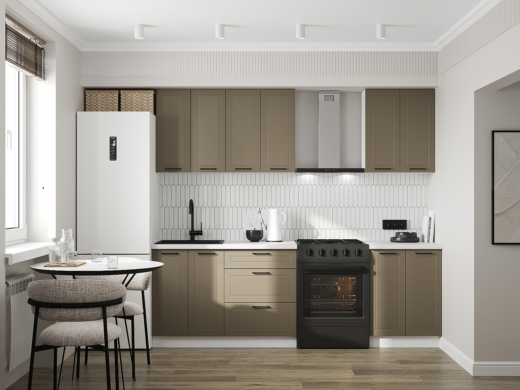 Конструкция позволяет расположить всю мебель вдоль одной стены и обустроить систему хранения продуктов, посуды и поварской утвари. Матовые фасады с рамочной фрезеровкой устойчивы к влаге, солнечному свету и механическим повреждениям.